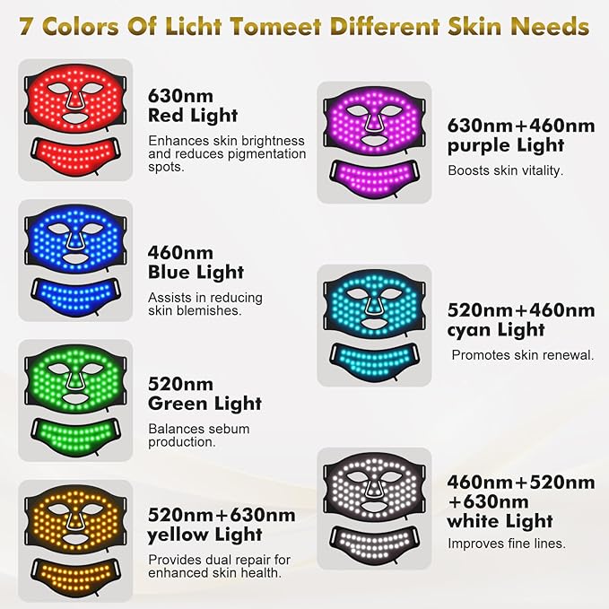 - 7 Color LED Face Mask: The LED mask light therapy features 309 LED beads seven different color lights for all skin types, and each therapy light has different effects. Red light therapy mask has 460nm, 520nm,630nm LED light, can meet all your needs