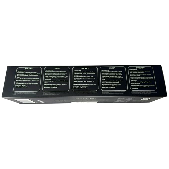 - 🌿 Five Soothing Herbal Blends: This premium caffeine-free tea sampler features five wellness-inspired blends — Soothe, Shine, Smooth, Sleep, and Synergy — crafted to support relaxation, digestion, balance, and better sleep.