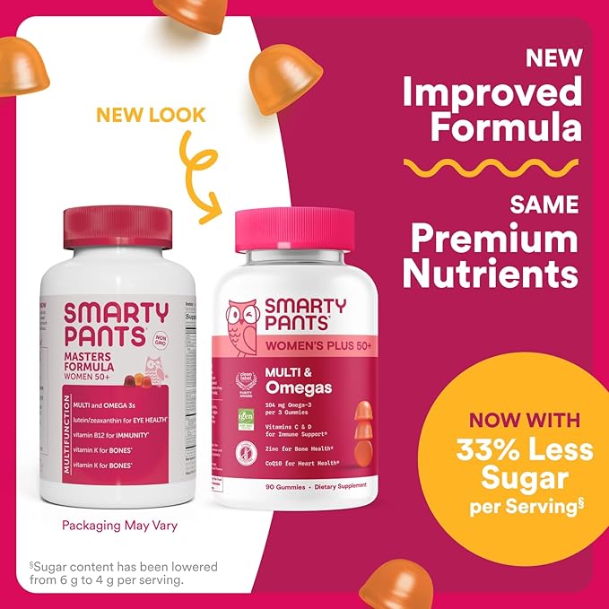 - PREMIUM, SCIENCE-BACKED GUMMY MULTIVITAMIN SUPPLEMENTS FOR WOMEN 50+: SmartyPants Women’s 50+Plus Multi & Omegas is specifically formulated with 21 nutrients, including Vitamins D, B12, CoQ10, folate, biotin, and Omega-3s to help fill average nutrient gaps women over 50 may have. Premium nutrients you deserve and a delicious taste you’ll love.*