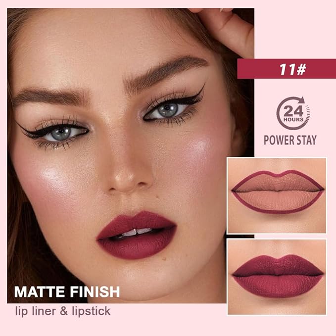 2 in 1 Matte Lipstick Lip Liner Pencil Set,Wine Red Waterproof Lip Stick Lip liner Combo for Old Women Long Lasting Lipstick,labiales mate 24 horas originales