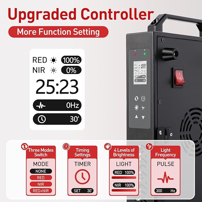 - Upgrade System & Modes Offer Multipurpose Use: Fumitt red & Infrared therapy device delivers a low heat release for skin contact use, smart control system gives you greater flexibility and personalization to create your own therapy. We prioritize the durability and efficacy of our devices. Comes as a full package and includes a user manual, hanging kit, and eye protection, complete with double built-in cooling fans to dissipate heat. Can placed on the table or hung on the wall..