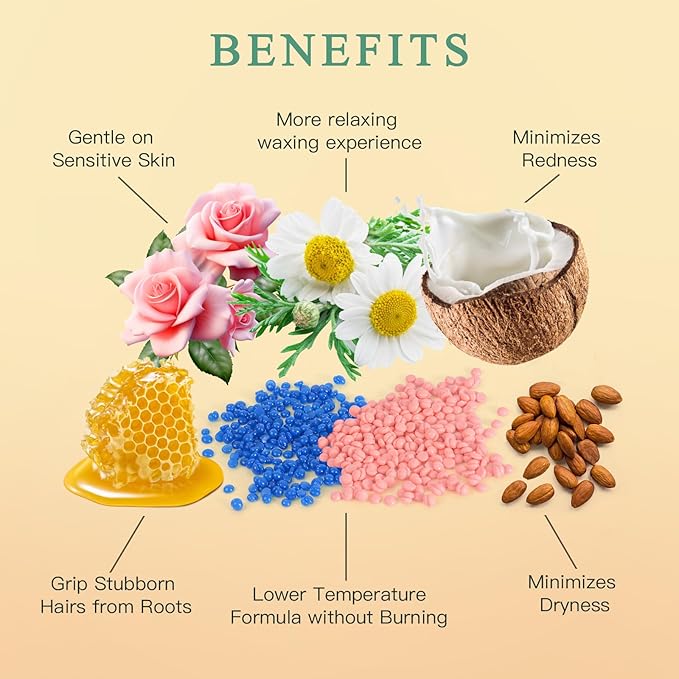 - Material Feature : Low-Melting & Even-Texture – Melts quickly and evenly for effortless spreading, allowing precise application and effective hair removal., Skin-Friendly & Hypoallergenic – Made with natural, ensuring a gentle hair removal process for all skin types, including sensitive skin., Works on All Skin & Hair Types – Effectively removes both fine and coarse hair, ensuring smooth results for all skin types, including sensitive skin. Low-Melting & Even-Texture – Melts quickly and evenly for effortless spreading, allowing precise application and effective hair removal., Skin-Friendly & Hypoallergenic – Made with natural, en… See more