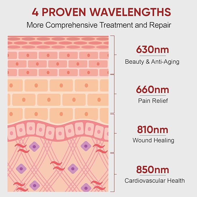 - 【4 Specific Proven Wavelengths】Our red light therapy for face and body delivers 4 proven wavelengths. Besides the standard 660nm red light and 850nm near-infrared light, we have also incorporated proven 630nm & 810nm wavelengths capable of delivering powerful results for superficial, localized and deep tissue. These wavelengths are ideal for skin health, increased blood flow, enhanced energy and performance, improved mental clarity, pain relief, sleep optimization and more!