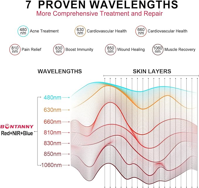 - Professional 7-Wavelength Full-Body Therapy - Featuring clinically-proven wavelengths (480nm/630nm/660nm/810nm/830nm/850nm/1060nm) for comprehensive care from skin to deep tissue. Blue light therapy enhances complexion, red light therapy boosts collagen, near-infrared therapy relieves pain, and far-infrared therapy promotes deep relaxation – delivering spa-quality treatment at home.