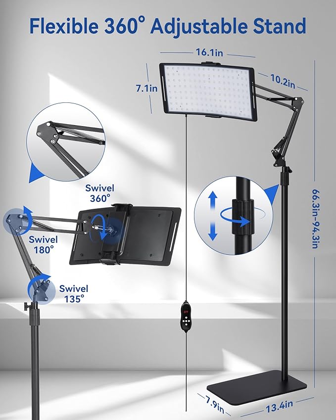 - [Fully Adjustable Design — Stable, Flexible, Easy Use] KingPavonini red light therapy lamp adjusts to your needs: extendable pole sets height, arm moves forward/back/up/down, and head rotates 360° for precise targeting; weighted non-slip base keeps it steady; 10ft long cord with simple controller make it easy to use anywhere—sofa, bed, workout bench, or recovery space