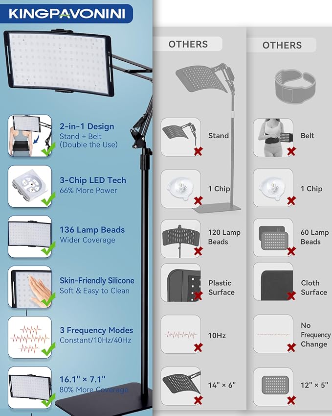 - [136-LED Dual Wave — Target Skin & Deep Tissue] KingPavonini red light therapy lamp with 136 LEDs, 3-in-1 chips (total 408 chips). 660nm red for surface skin + 850nm infrared for deeper layers — these two wavelengths work in synergy to support smoother-looking skin, promote circulation, ease tension, relax overworked muscles and joints after workouts or a long day, and encourage more restful sleep