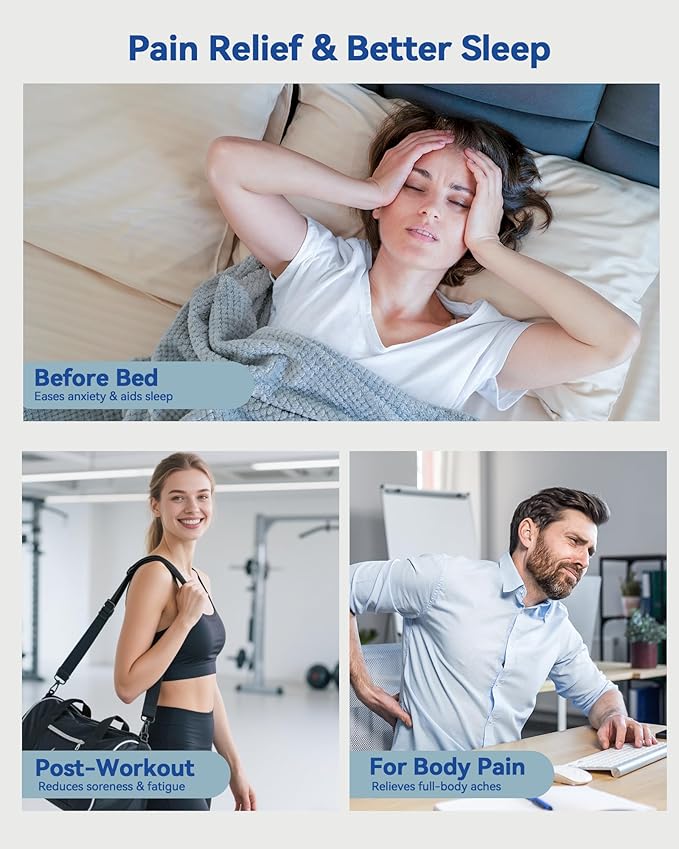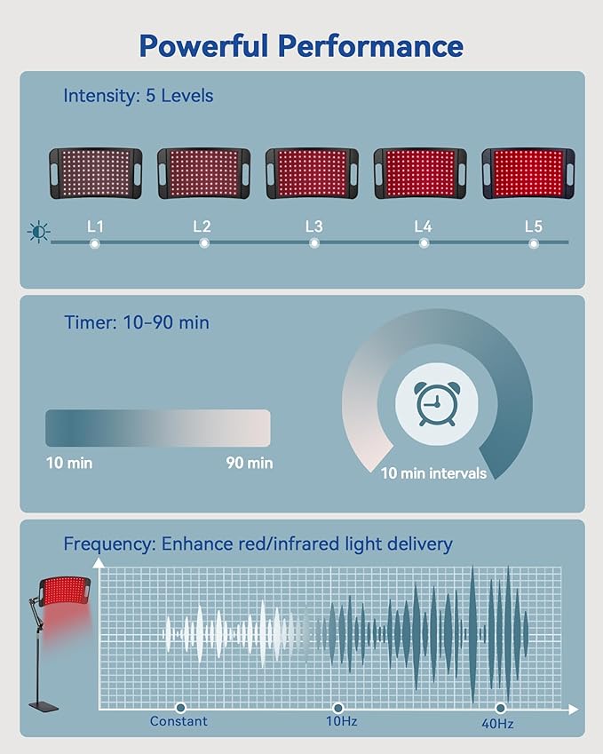 - [Powerful & Adjustable Red Light Therapy Device] 5 adjustable intensities (P1–P5) for comfort control; 3 pulse modes (10Hz/40Hz/Steady) designed to help enhance red/infrared light performance for targeted surface-to-deep relaxation, it aids post-activity recovery and overall vitality; 10–90 min auto timer (in 10-minute intervals) for precise session control