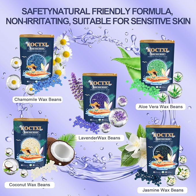 - [Dermatologist-tested and Certified] - 100% natural wax beans, safer for the skin. Contains five different extracts: chamomile, lavender, aloe vera, jasmine, and coconut. Specifically designed for sensitive skin, providing a gentle and effective hair removal experience. Suitable for all hair types and skin tones. From coarse hair to fine hair, even short hair and shaved hair, it can be easily removed.