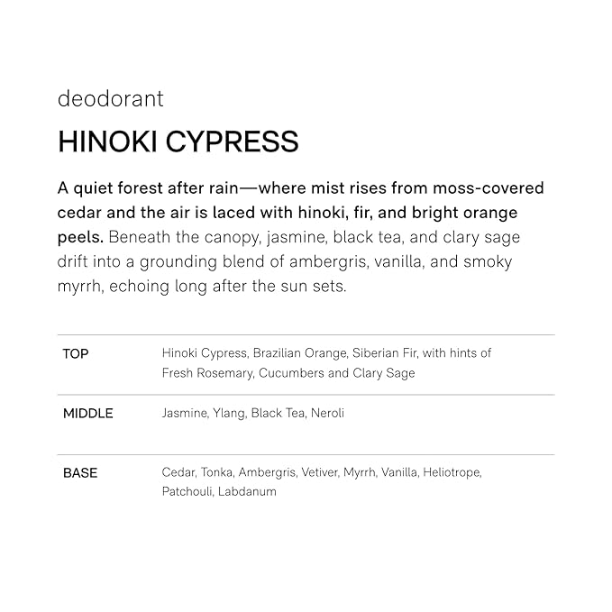 - 100% NATURAL BOTANICAL SCENTS: Choose from 4 scents: Hinoki Cypress, Santal Musk, Blood Orange, Cedar. These four scents are 100% botanically derived, formulated from rare natural extracts, isolates, and essential oils. But this isn’t your typical essential oil blend—this is a refined olfactory experience, elevated and modern. Each scent is thoughtfully composed to not only smell incredible but also support the effectiveness of our deodorant. Clean. Sophisticated. Subtle.