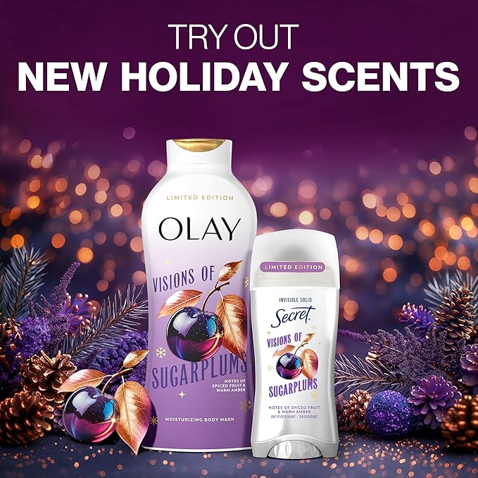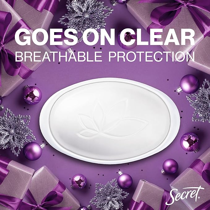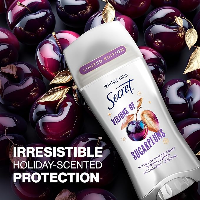 Secret Fresh Antiperspirant Deodorant for Women, 72hr Breathable Odor Protection with Pro-Hyaluronic Acid, Holiday Invisible Solid, Visions of Sugarplums with Spiced Fruit & Warm Amber Scent, 2.6 oz