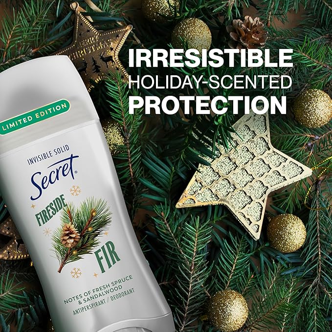 Secret Fresh Antiperspirant Deodorant for Women, 72hr Breathable Odor Protection with Pro-Hyaluronic Acid, Holiday Invisible Solid, Fireside Fir with Fresh Spruce & Sandalwood Scent, 2.6 oz