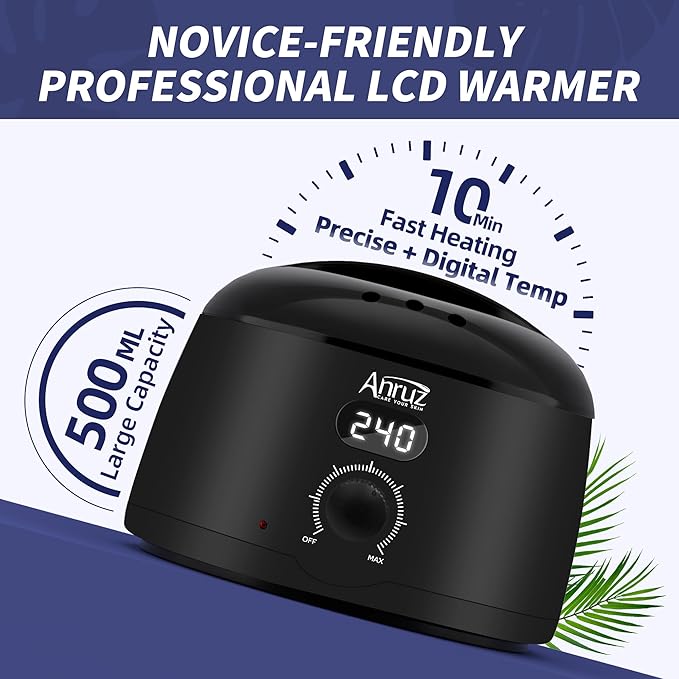 - All-in-One Pro Waxing Kit: Easy waxing at home, the upgraded ANRUZ wax kit contains everything you need: a digital display wax machine for precise temperature control, a silicone bowl, 4 bags wax beads (400 g total), 10 small sticks, 10 big sticks, 10 brow sticks, 5 waxing collars, 1 post-wax cream, and 1 user manual. Up to 97.53% of unwanted body hair can be removed with this professional waxing kit
