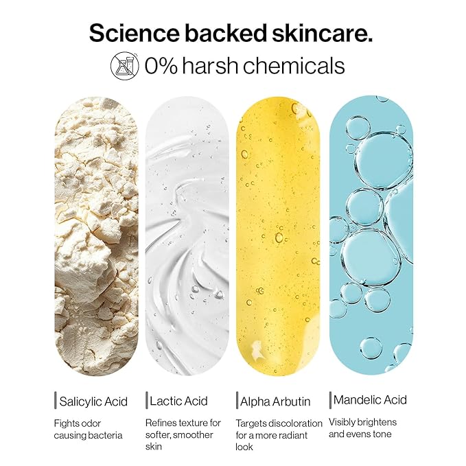 - Use on Whole Body - Lactic Acid & Salicylic Acid gently exfoliate, smooth, and brighten the underarms, elbows, intimate area.