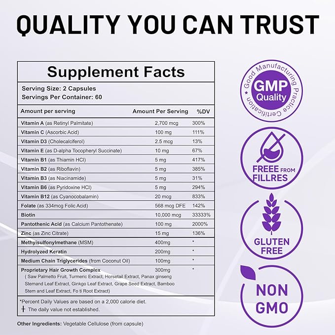 - ๐ฌ We believe that beauty comes from within, and choose our advanced hair, skin, and nail vitamins that women trust to enhance their natural beauty through effective, science-based nutritional support. Our biotin supplements are vegan, non-GMO, GMP-compliant and factory-produced, and for us, it's all about quality control - so you can feel confident in your dietary supplements.