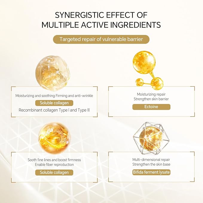 - 💧 Deep Hydration & Barrier Shield: Recombinant Collagen (Type I+III) + Ectoin intensely replenish moisture while sealing it in, visibly plumping thin/post-laser skin and reducing fine lines.