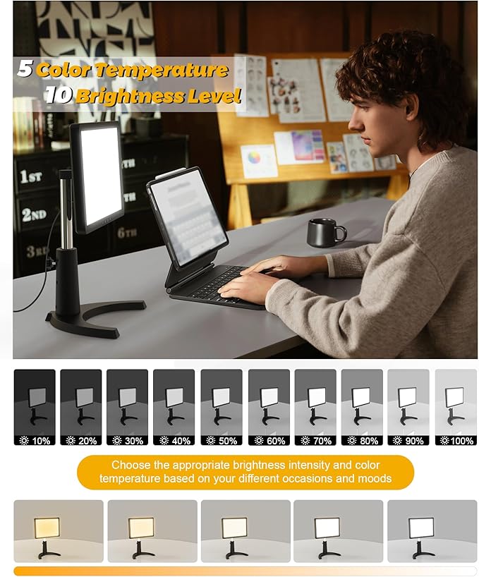 - 5 Adjustable Brightness & 45° Tilt Stand:Customize your light therapy session with 5 intensity levels (3000K/3500K/4000K/5000K/6500K) to suit your sensitivity and needs. The sturdy base allows for 45 degrees of tilt, ensuring the therapeutic light is directed at your optimal angle without staring directly into the lamp.