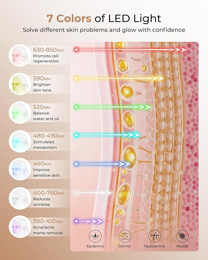 - 【7-Color Light Therapy Mode】: The LED light therapy mask features 7 distinct light colors and wavelengths that can be switched, effectively addressing multiple skin concerns. It delivers rapid, deep-level repair to the skin, actively promoting skin metabolism and collagen regeneration, offering diverse options for your skincare routine. You can use it anytime, anywhere—whether resting, reading, or working—making it an ideal gift for friends and family.