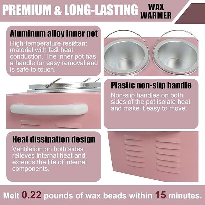 - 【Stylish Pink Wax Warmer】This professional double pot wax heater, featuring a stainless steel metal structure and aluminum pot body, is sturdy and durable, heats up quickly, and has a unique pink appearance, adding a touch of elegance to your space. It brings great convenience to waxing and hair removal work and is very suitable for use in homes, beauty salons, spAs, barber shops, etc