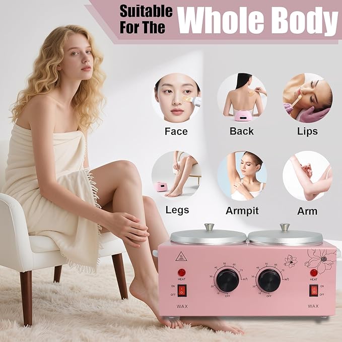 - 【Wide Application 】This double-pot hair removal wax machine can be used for hair removal from hands, feet, face and the whole body. Perfect for melting Brazilian wax beans, canned wax, wax cubes, wax bean hair removal and many other types of wax. Double-pot wax heater, featuring both rapid heating and overheat protection. It only takes 10 to 15 minutes to melt wax in the pot