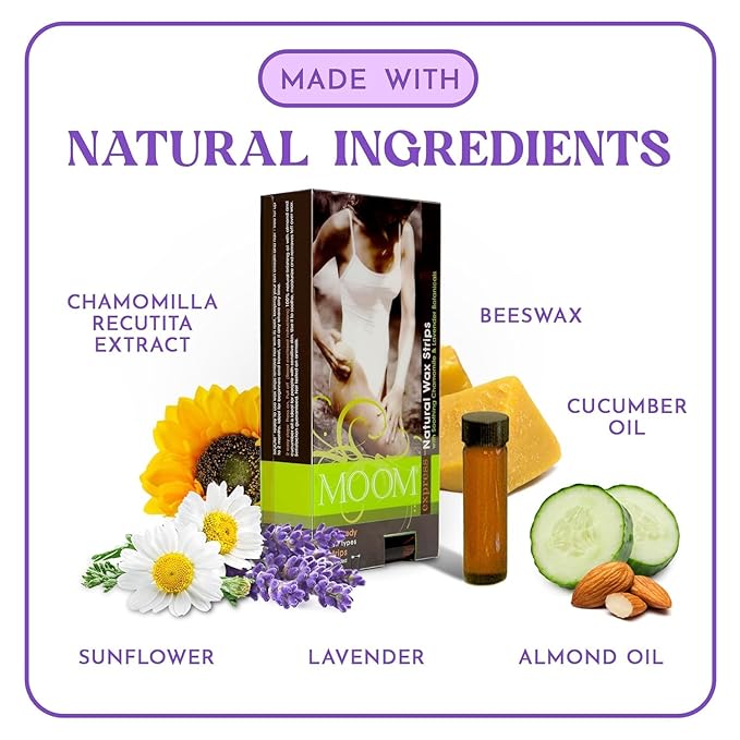 - No-Chemical Wax Strips for Hair Removal – Formulated with lemon juice, sunflower oil and other organic ingredients, MOOM's on-the-go hair removal strips pamper your skin while you wax. Gentle on the skin, our wax strips with no-chemical formula provides a non-irritating hair removal experience that is suitable for all skin types.