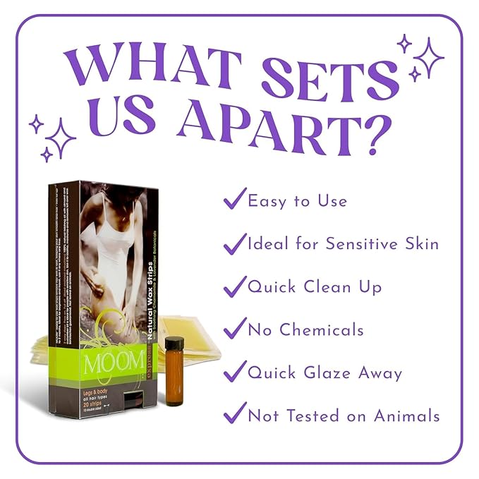 - Gentle for All Skin Types – MOOM focuses on your skin’s health and vitality, so we’ve infused these on-the-go wax strips with lavender oil and chamomile extracts. Whether you have dry, oily, combination or sensitive skin, each hair remover strip removes hair easily with our waxing strips.
