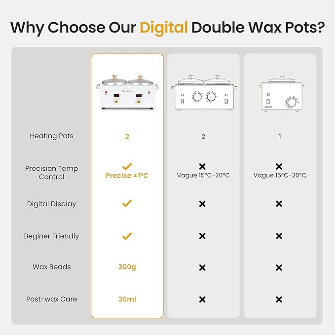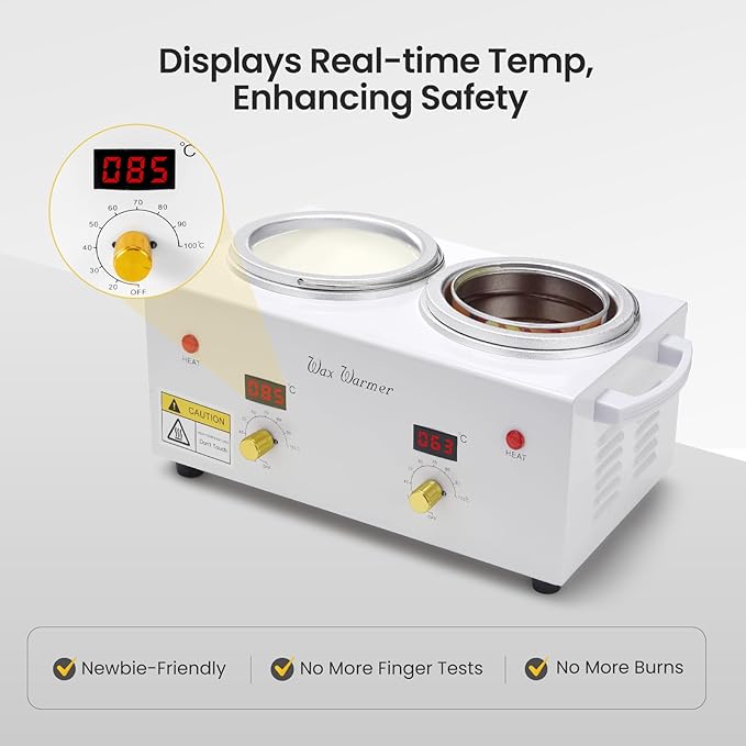 - Double-Pot Design Cuts Waiting Time by 50%: The wax pot features two independent inner pots with separate temp controls: heat two wax types at once or double your supply. Perfect for busy salons or efficient at-home sessions—spend less time melting, more time getting smooth results