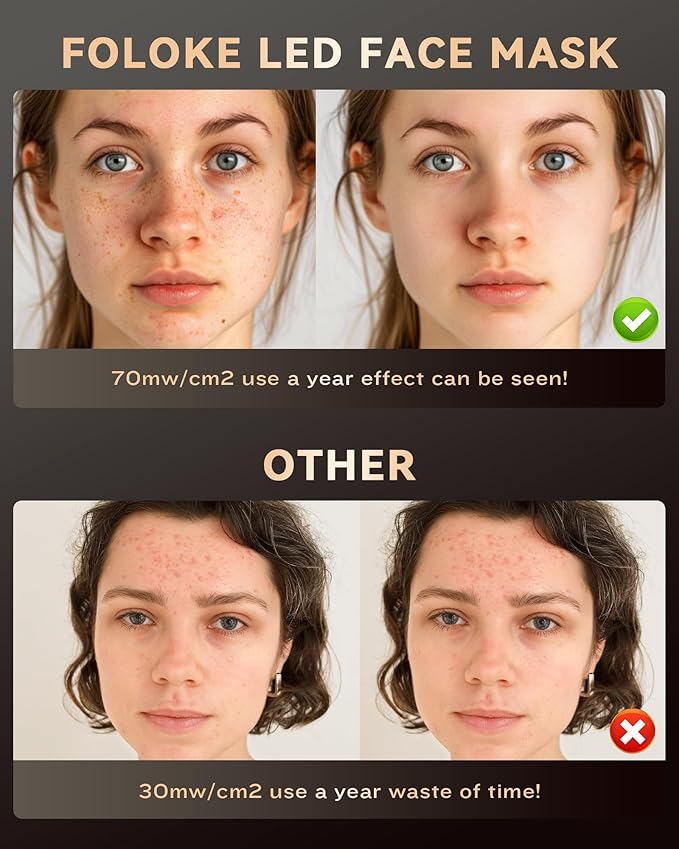 - ❤️【Clinically Proven Light Therapy】FOLOKE Red Light Facial Treatment Mask uses 320 medical-grade LED lights with wavelengths of 470nm, 630nm, 660nm and 850nm to smooth fine lines and promote collagen production. Red light + blue light can effectively fight aging and repair facial blemishes, while blue light can soothe and repair skin blemishes. Each 10-minute treatment provides 70mW/cm²-100mW/cm² of energy, ensuring deep absorption for safe, effective and lasting skin rejuvenation.
