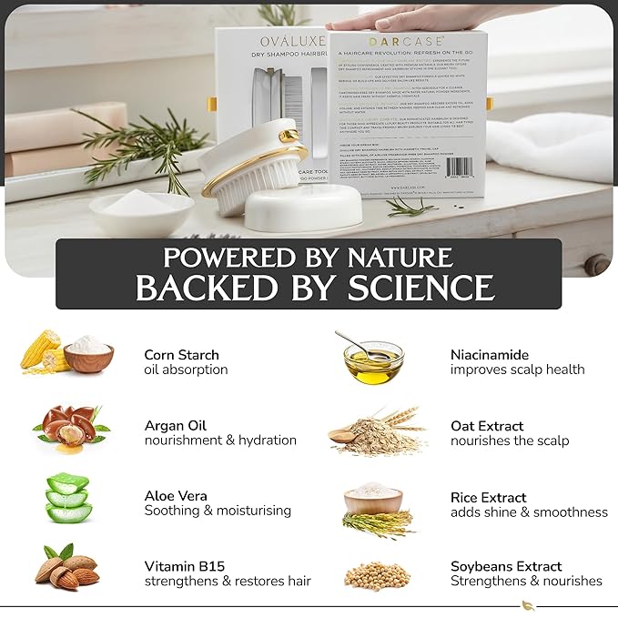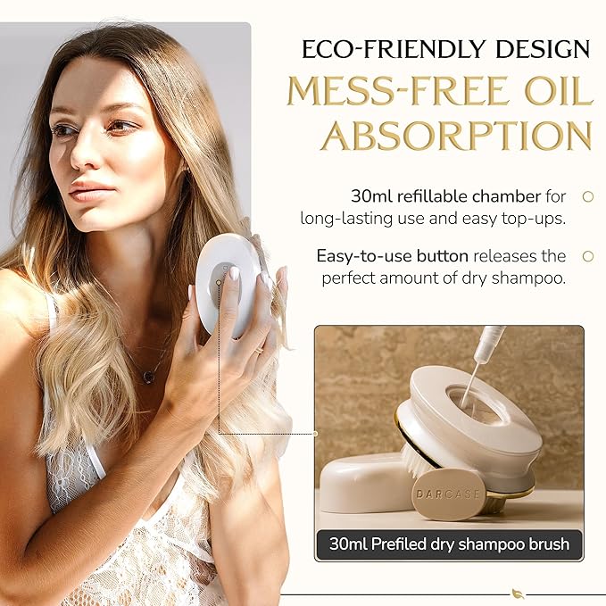 DARCASE Premium Dry Shampoo Brush - Non Aerosol Dry Shampoo for Women - Refillable Travel Size Powdered Shampoo Brush - Travel Essentials for Women - Pre-Filled 30ml Unscented Talc Free Hair Powder