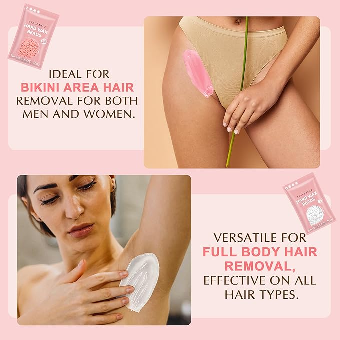 - TARGETED WAX BEADS FOR EVERY AREA : This versatile waxing kit features two specialized hard wax formulas to meet all your hair removal needs. The rose wax beads are specially designed for sensitive and coarse hair areas, such as the bikini zone.The unscented white wax beads are extra gentle, making them ideal for full-body use and sensitive skin, including the face and underarms.Tailored for different skin types and hair textures, these beads make the system perfect as a body wax kit, leg waxing kit for women, or eyebrow wax kit.