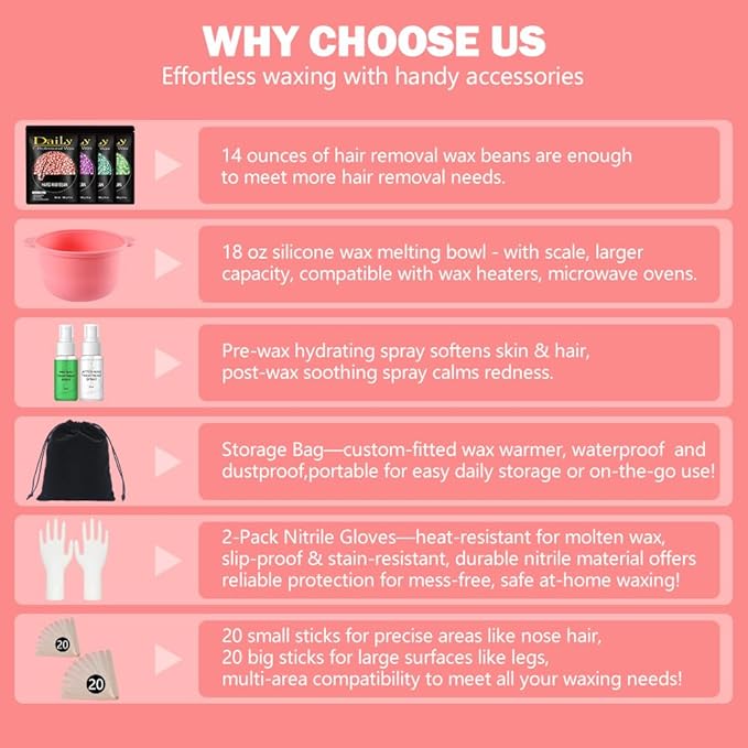 - Packing list: wax heating machine, BPA-free silicone bowl, 1 portable waterproof storage bag,pre wax spray, post wax spray, 40 large and small wax sticks, 4 bags of hard wax beads, 1 pair of gloves.