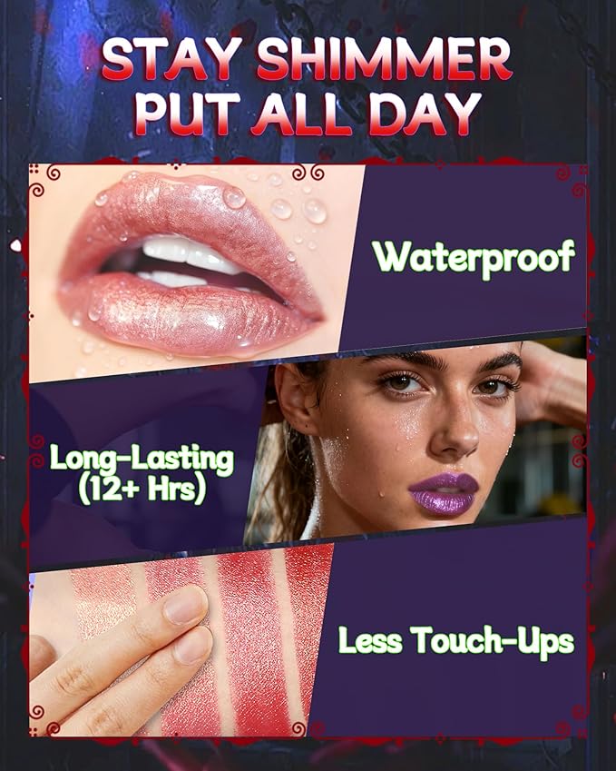 - Waterproof & Silky Formula -- Our metallic lipstick not only provides powerful waterproof and smudge-proof effects, but also features a lightweight silky cream formula—free from annoying stickiness or heavy stuffiness. This glitter lipstick glides on without clumping or settling into lip lines, and better yet, it won’t stick to your hair. The shimmer lipstick can spare you the embarrassment of hair sticking to your lips on windy or rainy days.