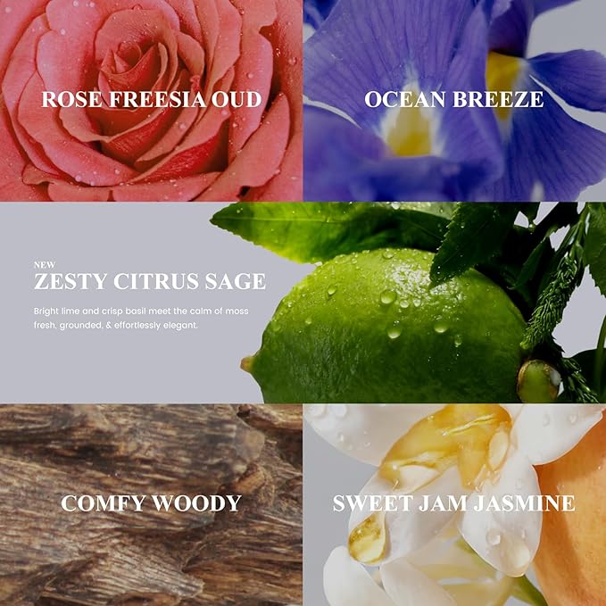 - 5 Distinct Fragrances: Collection includes sophisticated scents: energizing Zesty Citrus Sage with lime and basil, floral Sweet Jam Jasmine, fresh Ocean Breeze, warm Comfy Woody, and deep Rose Fressia Oud. Each offers unique long-lasting aroma