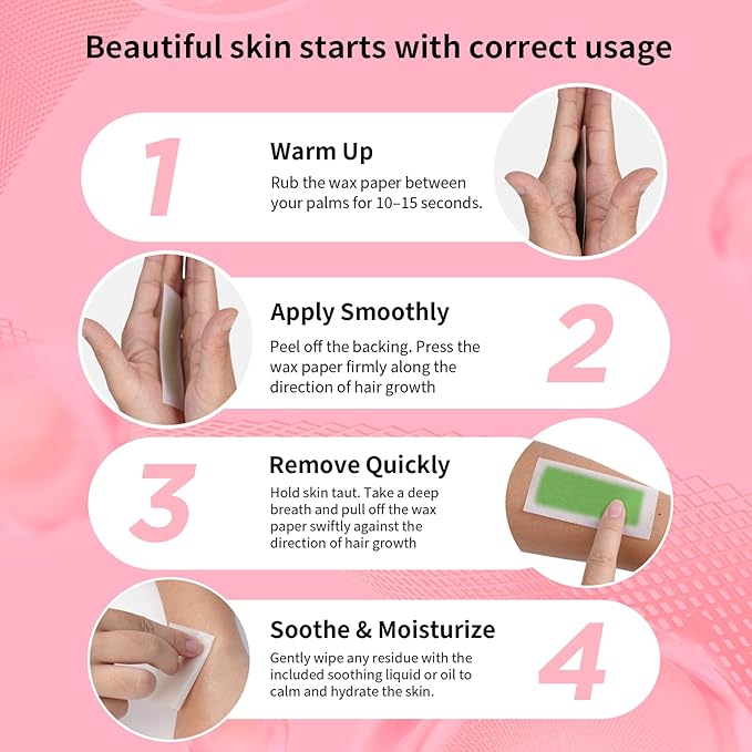 - Sensitive Skin Safe: Gentle Yet Effective: Formulated with hypoallergenic ingredients, these wax strips are specifically suitable for sensitive skin hair removal. They avoid harsh chemicals that cause redness, itching, or irritation, ensuring a comfortable experience even for those with delicate skin. Compared with other wax strips, our product is more soothing when removing hair,making it a safe choice for all skin types.