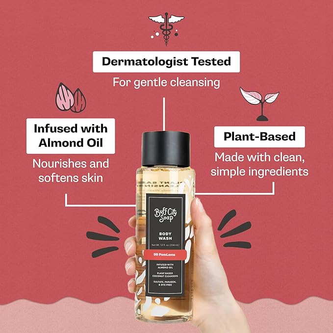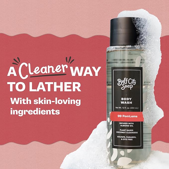 Buff City Soap Plant-Based Body Wash - Coconut Cleansers & Almond Oil Infused. Gentle & Rich Non-Drying Lather, Helps Reduce Moisture Loss & Supports Natural Skin Barrier - 99 Pomlems, 12 fl oz