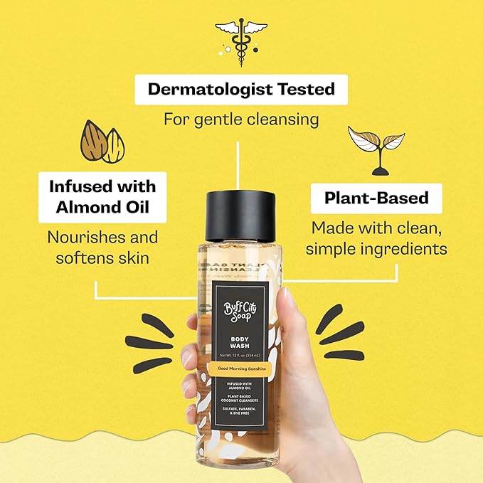 Buff City Soap Plant-Based Body Wash- Coconut Cleansers & Almond Oil Infused, Gentle & Rich Non-Drying Lather, Helps Reduce Moisture Loss & Supports Skin Barrier-Good Morning Sunshine, 12 fl oz