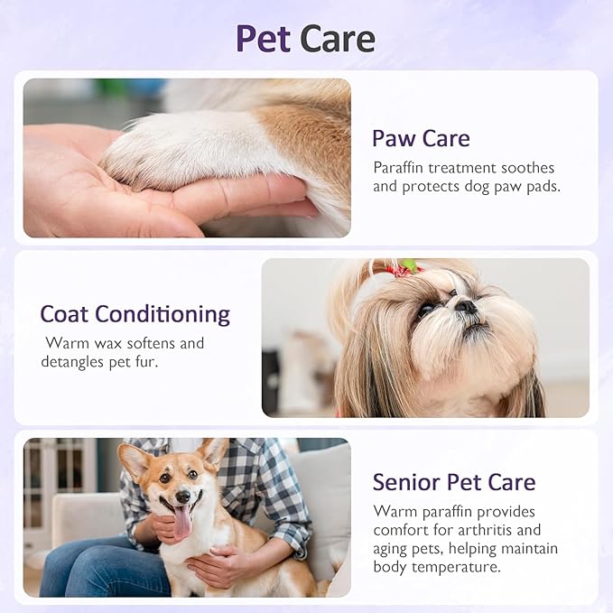 - Pet Care: Paraffin wax warmer is an ideal choice for pet care, especially for senior pets or those with dry skin issues. The paraffin wax for feet effectively relieves joint pain, enhancing comfort. Additionally, paraffin baths help soothe and protect the paw pads of cats and dogs, and can also soften and untangle their fur. Paraffin treatment provides physical comfort for pets while helping them stay active and healthy.