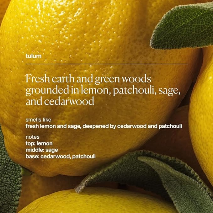 - LEMON, SAGE & PATCHOULI FRAGRANCE: Enjoy the earthy scent of Tulum, a blend of fresh earth and green woods grounded in lemon, patchouli, sage, and cedarwood with our heat activated fragrance.