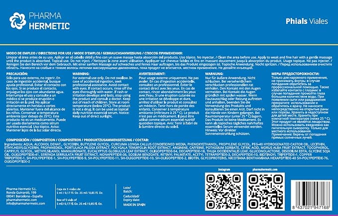 - Active Ingredients : Biotin (Vitamin B7) Caffeine Peptide Complex Arginine Panthenol (Pro-Vitamin B5) Amino Acids (varies by batch) Plant Stem Cell Extracts (Hermetic formula) Vitamin Complex (B-group derivatives) Biotin (Vitamin B7) Caffeine Peptide Complex Arginine Panthenol (Pro-Vitamin B5) Amino Acids (varies by batch) Plant Stem Cell Extracts (Hermetic formula) Vitamin Complex (B-group derivatives)